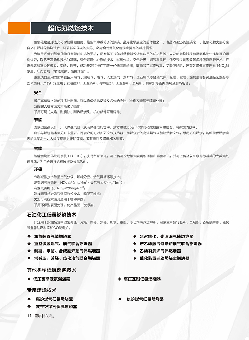 超低氮燃燒技術、 富氧純氧燃燒工程技術、 廢液廢氣焚燒工程技術、 工業廢氣VOCs綜合治理技術、 火炬氣回收及工業火炬技術、 點火及摻燒技術、